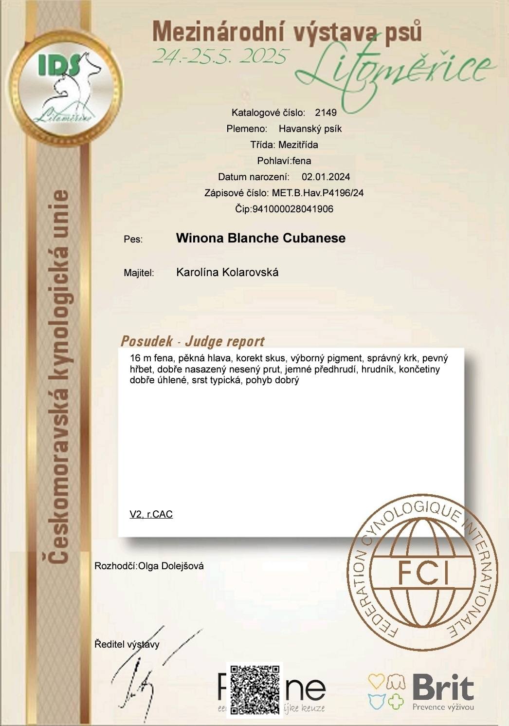O: Athos Havana Angel NavajoInt.Ch.,RO.CH., RO.GCH, SK.JCh., ÁBE-CL.CH, SLO.CH, SRB.CH., HR.CH, RO.JCh, 6xCACIB, CAJC, 2xBOJ, J.BOB, R.CACIB, 2xBest Male, Grand Prix SK, 11xCAC, 10xBOB, R.BOG, 5xCAJC, 3xBOS, CL.W.,